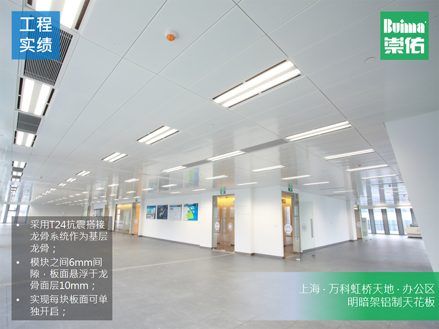 崇佑(中國)的這款明暗架天花係統的板麵可采用鋼製天花板也可采用鋁製天花板,可以根據設計師對空間不同的述求進行選擇。如需防火時效,則采用鋼製天花板;如需輕便且對防火要求不高,則采用鋁製天花板。這個明暗架係統天花可以做組合式天花吊頂係統的結構,可以通過300*300(mm)、300*1200(mm)、400*1200(mm)、600*1200(mm)、1200*1200(mm)這些尺寸,來滿足設計師對空間不同功能區的劃分。再者,這款天花係統,采用了明架係統的優勢,就是龍骨係統本身是抗震防火龍骨,可以廣泛應用於地震帶項目或者對防火時效有要求的場所;另外又結合了暗架係統的優勢,便利拆卸安裝且自帶防風結構,這樣就不會存在因為空間氣流問題而突然被掀翻的天花板砸到人的問題。